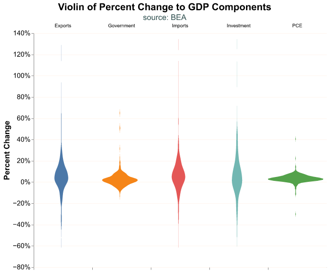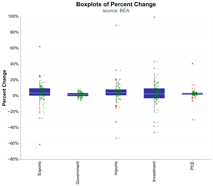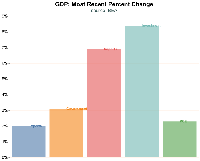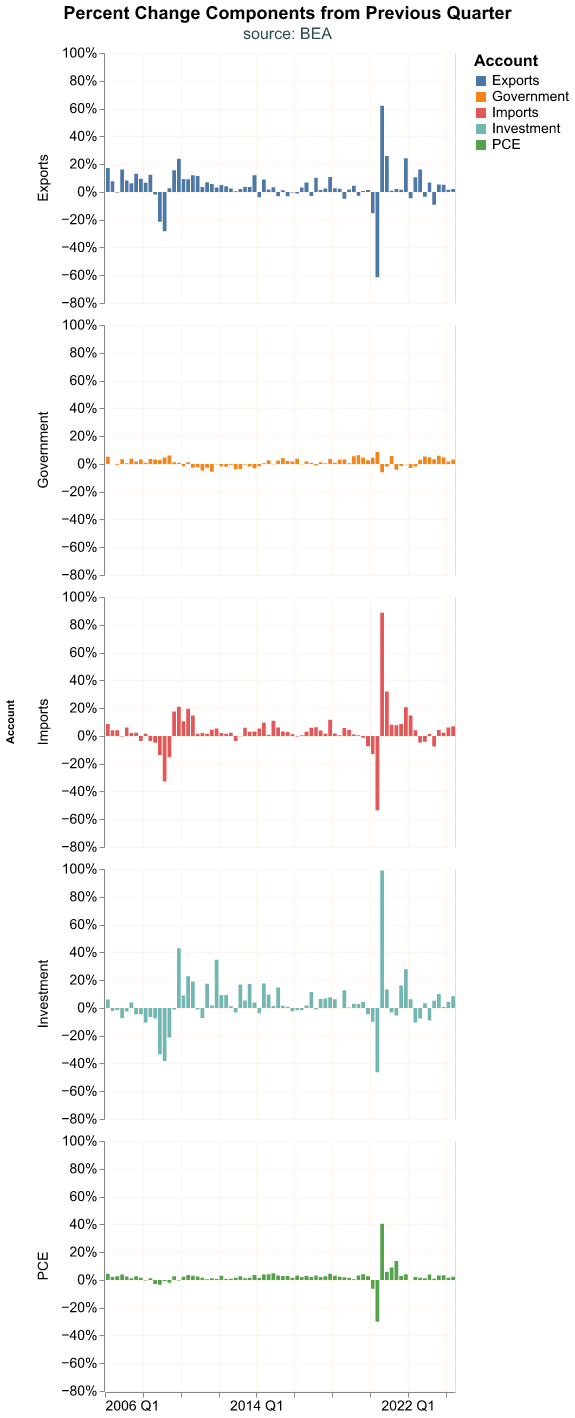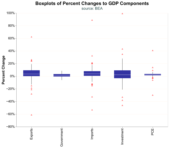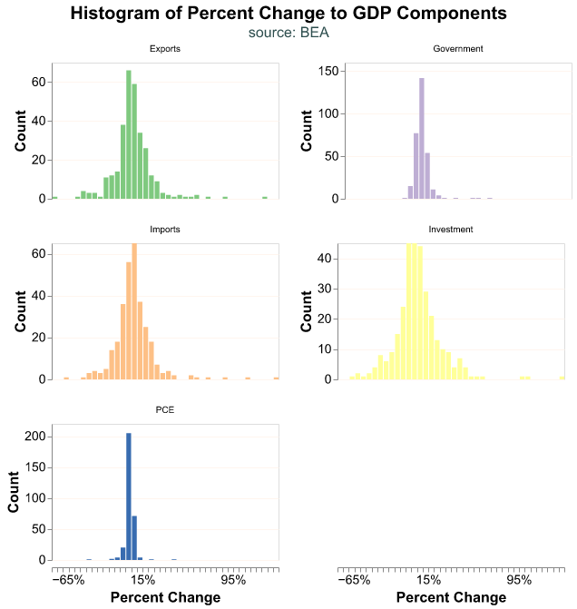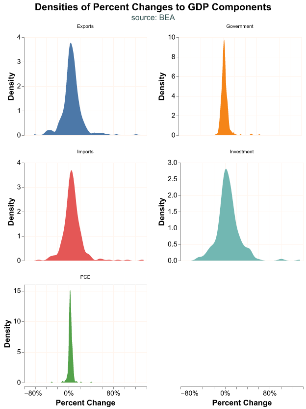 GDP is reported quarterly by the Bureau of Economic Analysis (BEA) and consists of four components: Consumption, Investment, Government Expenditures, and Net Exports. Each component can be further divided into sub-components. When we talk about GDP we are referring to the sum of these components. We could analyze components individually, for example if we were particularly interested in personal consumption or housing investment.