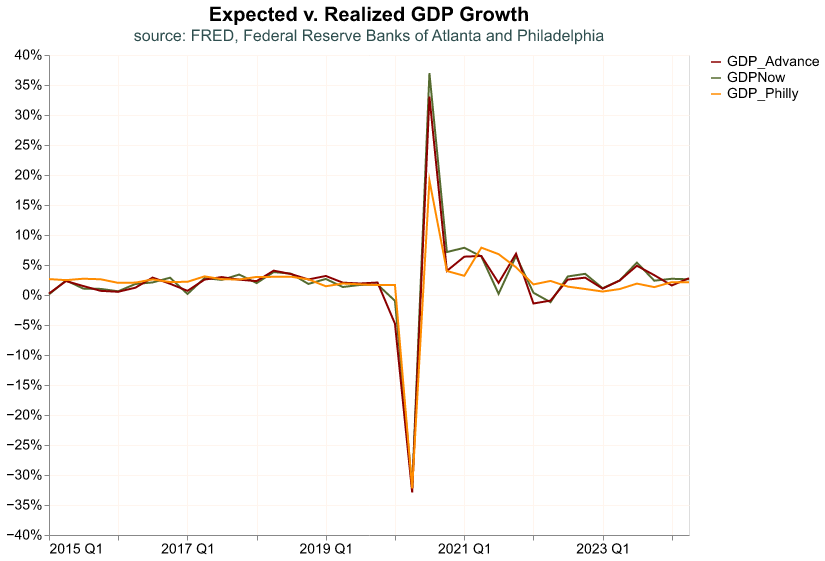 The two forecasts track the realized value of GDP quite closely, reassuring us that they are good measures of expectations. Nevertheless, the GDPNow estimate seems to track closer the realized GDP.