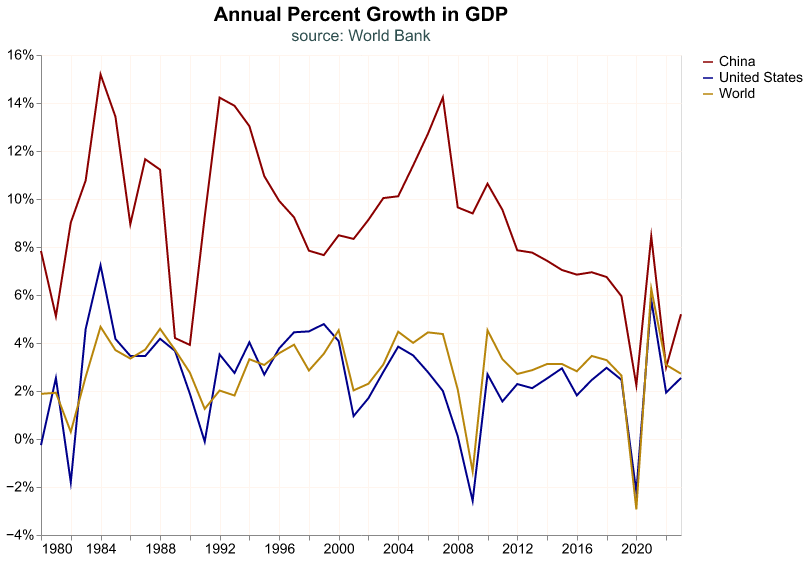 )The U.S. growth rate tracks the world’s rate closely, a little bit faster in the 1990s and a little slower in the 2010s, this makes sense since the U.S. is the largest economy in the world. China, on the other hand, grows much faster from the early 1990s to the late 2010s, even reaching double digit GDP growth in several years. However, since the global financial crisis its growth rate has decelerated noticeably.