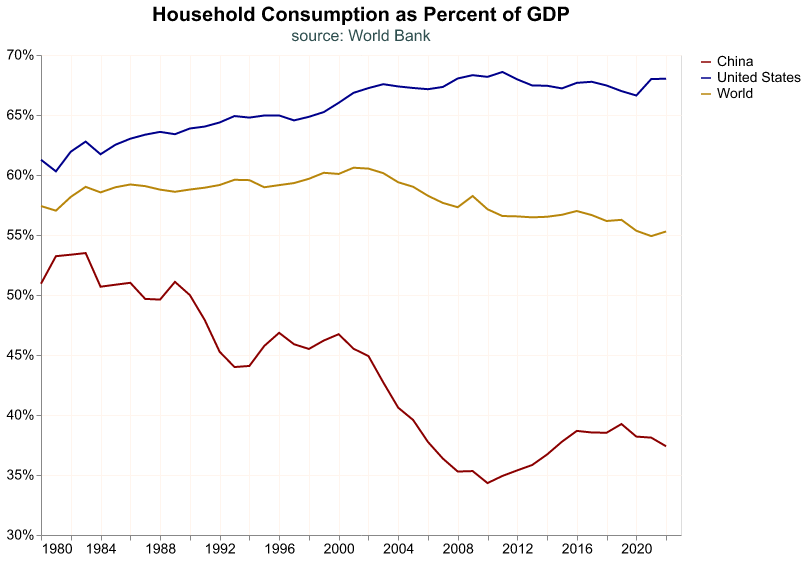 )Here we observe the opposite story. Household consumption in the U.S. comprises around two thirds of GDP and seems to be growing in importance over time, whereas in China it is close to one third and decreasing over time.