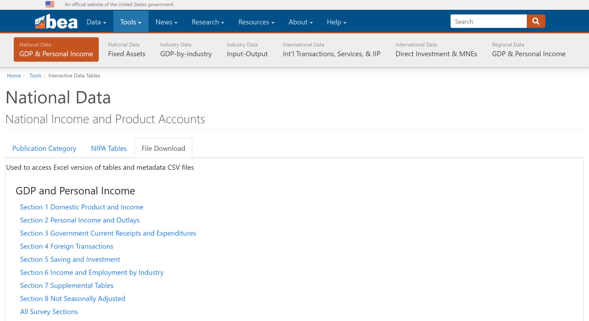 The first list is Section 1 Domestic Product and Income, copy the address of this hyperlink and assign it to an object called url—this is where the BEA stores its GDP data.